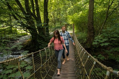 Am Ende des Rundweges folgt für mich das Highlight: Eine Hängebrücke, die meine ganze Konzentration und vor allem mein Gleichgewicht fordert, führt mich über die Aa in Richtung eines Matschbeckens.