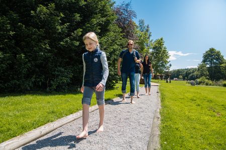 Das wird doch nicht zum Barfußpfad gehören? – war mein erster Gedanke. Oh doch, das tut es! Vorsichtig, mit einer Hand am Geländer, lasse ich einen Fuß mit den Zehen zuerst in die dunkelbraune Masse eintauchen. Etwas unheimlich ist mir das Ganze zunächst schon. Ein wenig rutschig ist es zudem, aber je weiter ich in dem Becken voranschreite, desto mehr wandelt sich meine Skepsis in Genugtuung. Der Matsch kühlt meine Füße und Waden wunderbar. Und, seien wir ehrlich, so ein Matscherlebnis macht jede Menge Spaß und erinnert mich an Kindheitstage, an denen man sich ohne Rücksicht auf Verluste einsudeln durfte.