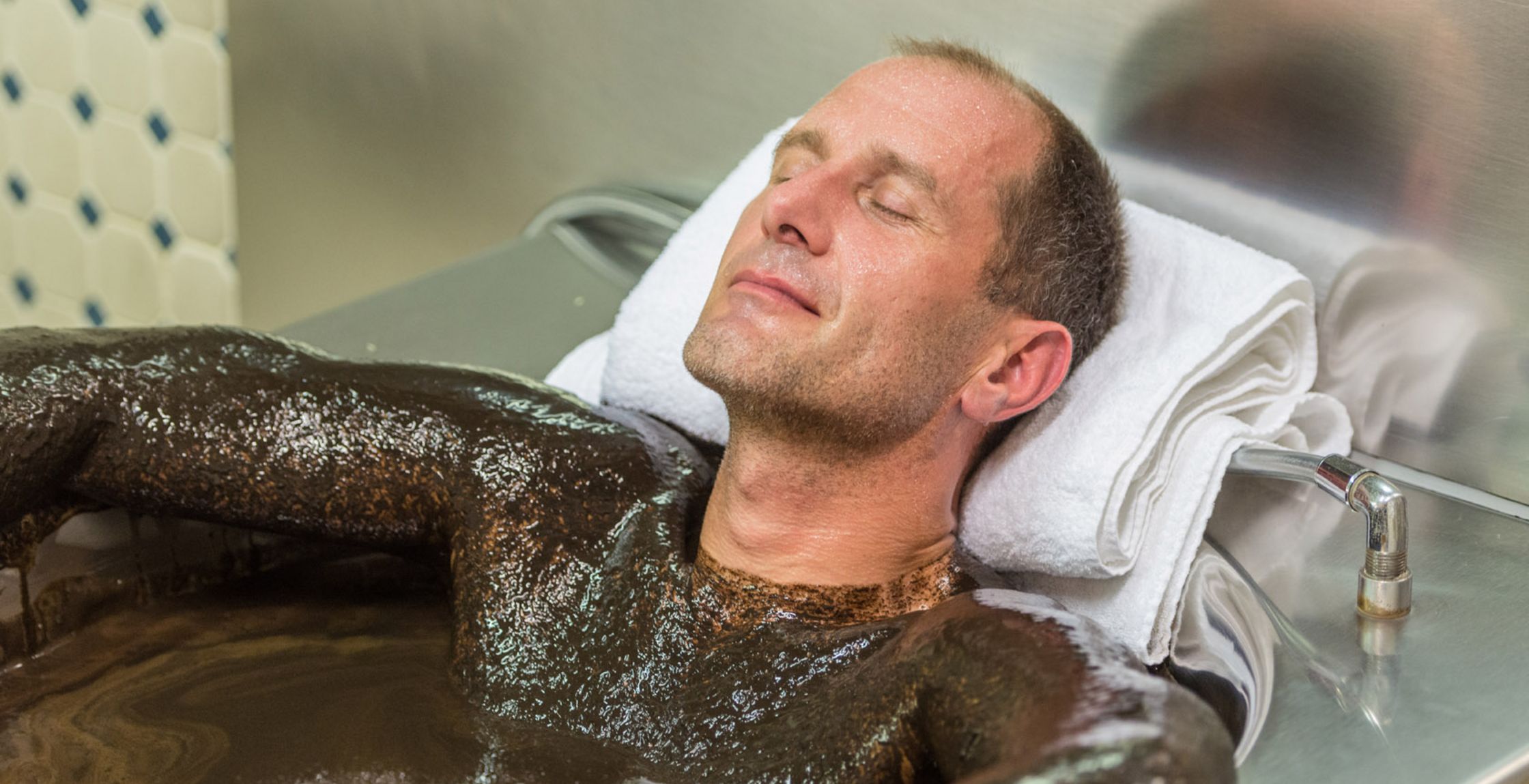 Mann entspannt im Moorbad in Bad Driburg