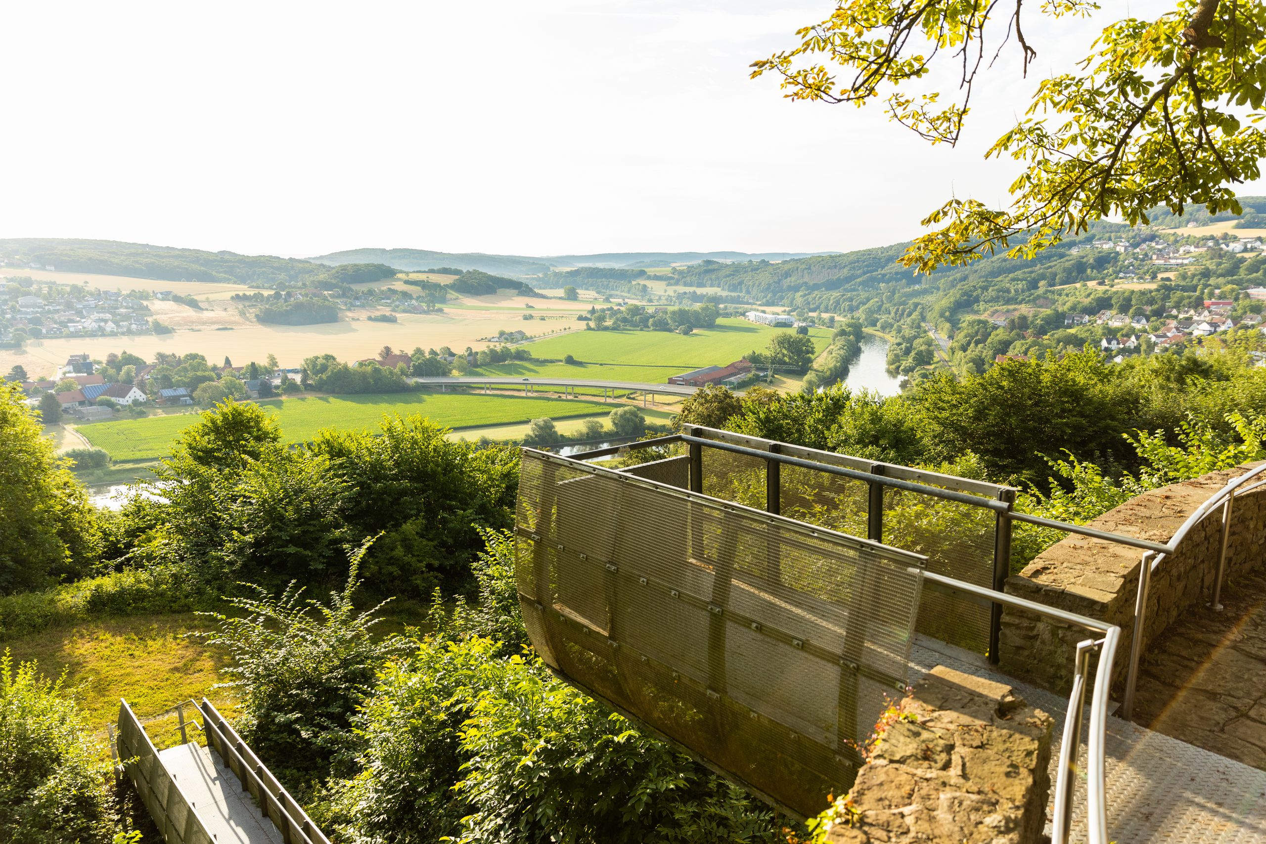 Vorbei geht es am Kurparksee und an der VitaSol Therme in Richtung Vlotho. Etwas abseits der Strecke könnt Ihr einen Stop beim Klang- und Heilpark im Kurpark einlegen. Dieser ist jederzeit zugänglich. Geht unbedingt in die Klanghütte – hier erwartet Euch ein ganz besonderes Klangerlebnis. Nach einiger Zeit kommt Ihr bereits in die Innenstadt. Ein Stück weiter könnt Ihr außerdem die Burg Vlotho besuchen. Eine Rast sowie eine Stärkung bieten sich hier an. Von der Burgmauer des Biergartens erwartet Euch ein herrlicher Ausblick auf das Wesertal.