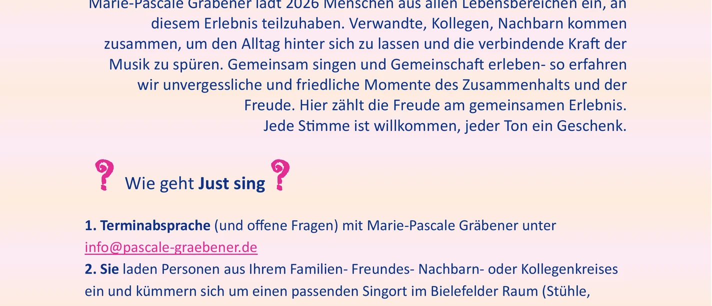 Im Rahmen des Singprojektes Einfach singen- Just sing!! 2026 lädt Marie-Pascale Gräbener mit Gitarre und Stimme zum Frühlingssingen auf den Kirchhof der Johanniskirche ein. Wir singen von süß bis sauer und leise bis Herzhaft. Textblätter werden verteilt. Jede Stimme ist willkommen. Auch HörgeräteträgerInnen sind herzlich willkommen. Wir finden den richtigen Ton und der richtige Ton findet uns.