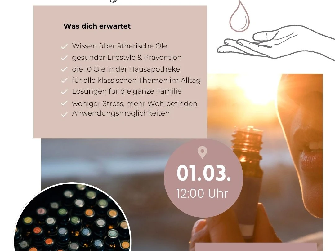 Ich biete ein kostenloses Kennenlernen der ätherischen Öle von DoTERRA an. Im Fokus steht bei diesem Termin die Hausapotheke. Wir werden uns ca. 1,5 - 2 Stunden durch alle Öle riechen, alle wesentlichen Infos zusammenfassen und herausfinden, womit wir dich und deine Familie natürlich und ganzheitlich unterstützen können.