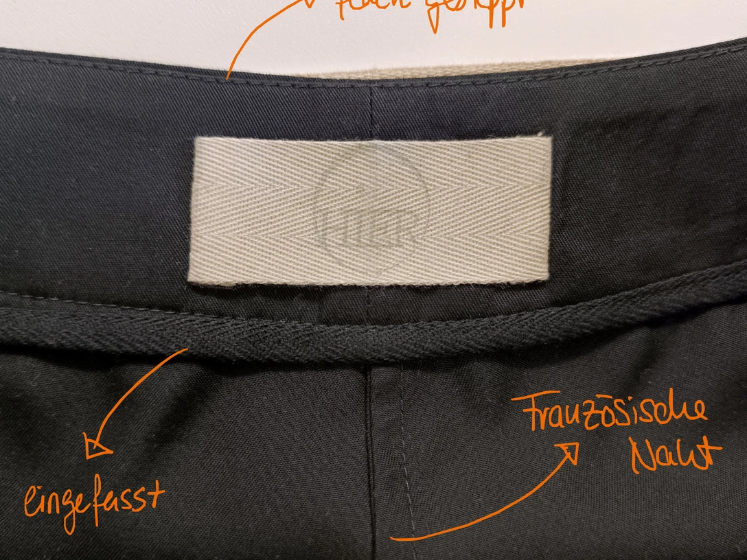 - Versäuberung: Die gerade Schließnaht kombiniert mit Overlock-Versäuberung.