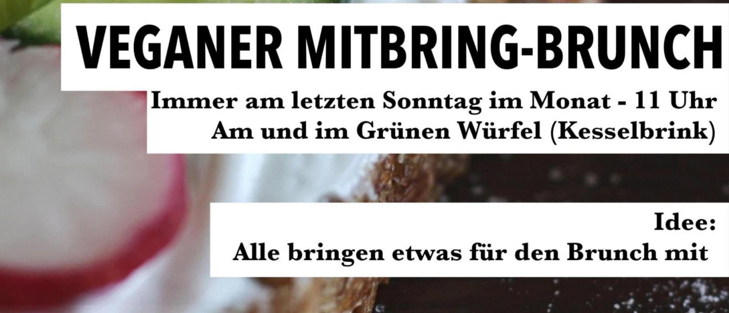 Jeden letzten Sonntag im Monat ab 11 Uhr veranstalten wir mit großer Freude den veganen Mitbring-Brunch im Grünen Würfel. Dieser ist für alle offen. Unser Ziel ist es, Menschen verschiedener Gruppen aus dem Bereich Umwelt- und Klimaschutz zusammenzubringen, um sich bei einem gemütlichen Brunch auszutauschen oder einfach die veganen Mitbringsel zu genießen.