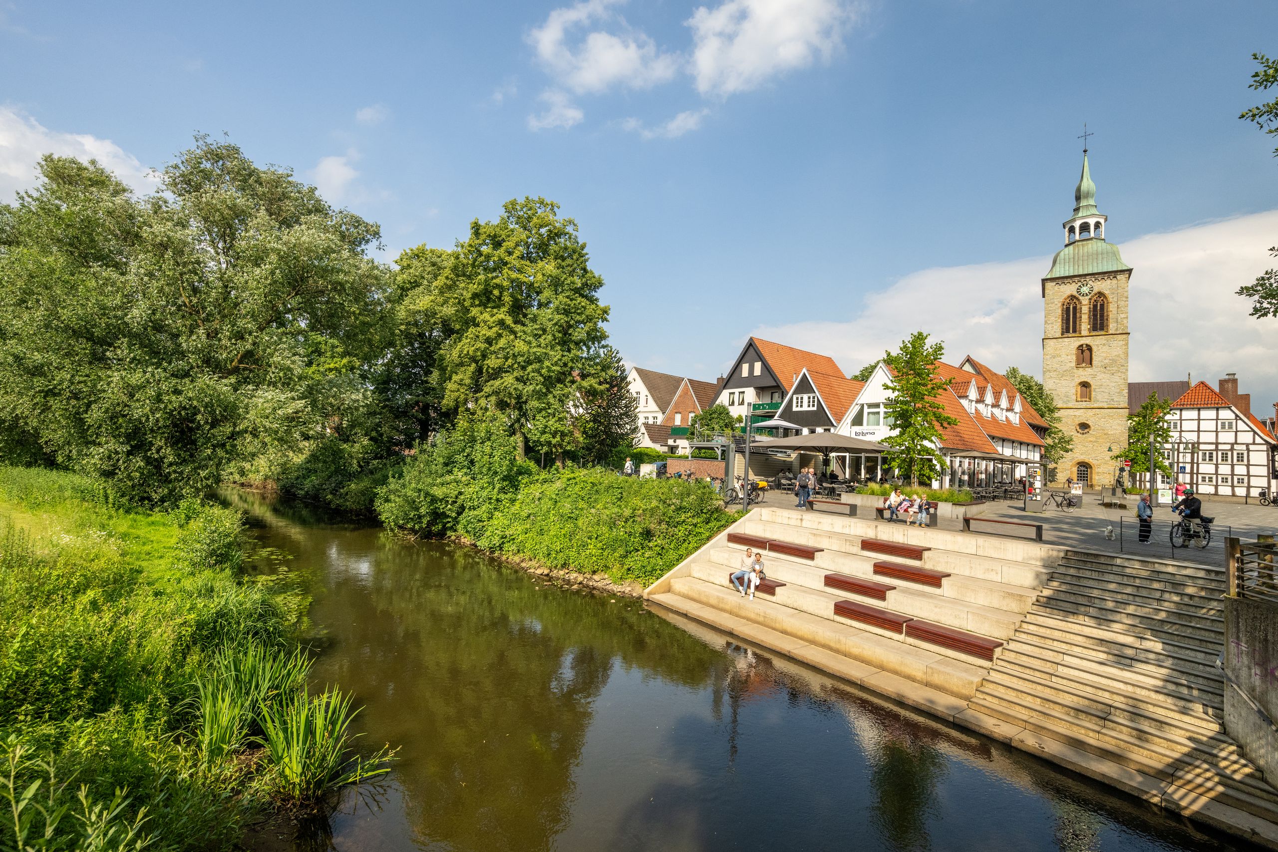 In den Altstädten können Sie neben Fachwerkhäuser, Boutiquen und kleine Cafés erkunden. Kulinarische Vielfalt – von westfälischer Küche bis zu internationaler Gastronomie – prägt das Stadtbild ebenso wie die entspannte Atmosphäre am Wasser. Aktivurlauber kommen etwa auf dem EmsRadweg auf ihre Kosten.